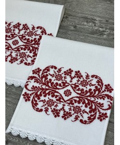 Пара рушників під ікони з машинною вишивкою на відбіленій тонкій батист-бавовні білим шовком. Декоровані атласним кантом та мереживом. Розмір 30х140см. Ціна за пару. Виробник VA Style Київ, Україна