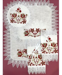 Набор для венчания в белом цвете с машинной вышивкой крестиком. В набор входят: 1 круглая салфетка под кольца, 2 салфетки для держания венцов, 2 завязывающихся подсвечника. Предметы набора выполнены из 100% льна и хлопкового кружева по краю.Отдельно вам понадобятся на вечнание: рушник под ноги, рушник для перевязывания рук, 2 рушника под иконы и...