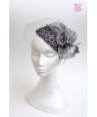 Под заказ. Шляпка каплевидной формы в сером цвете с серебристо-черным кружевом и вуалью.