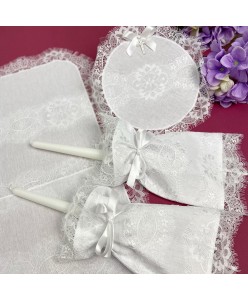 Набір платочків та свічки для вінчання, хрестин. В набір входять- два квадратні платочка з якісної відбіленої бавовни та з французським мереживом шантільї 35х35 см, два тримачі для свічок з білими парафіновими свічками (розмір тримачів 25 см висота, 10 см ширина), та серветки під обручки або для хрестика. Робота студіі VA Style Київ.