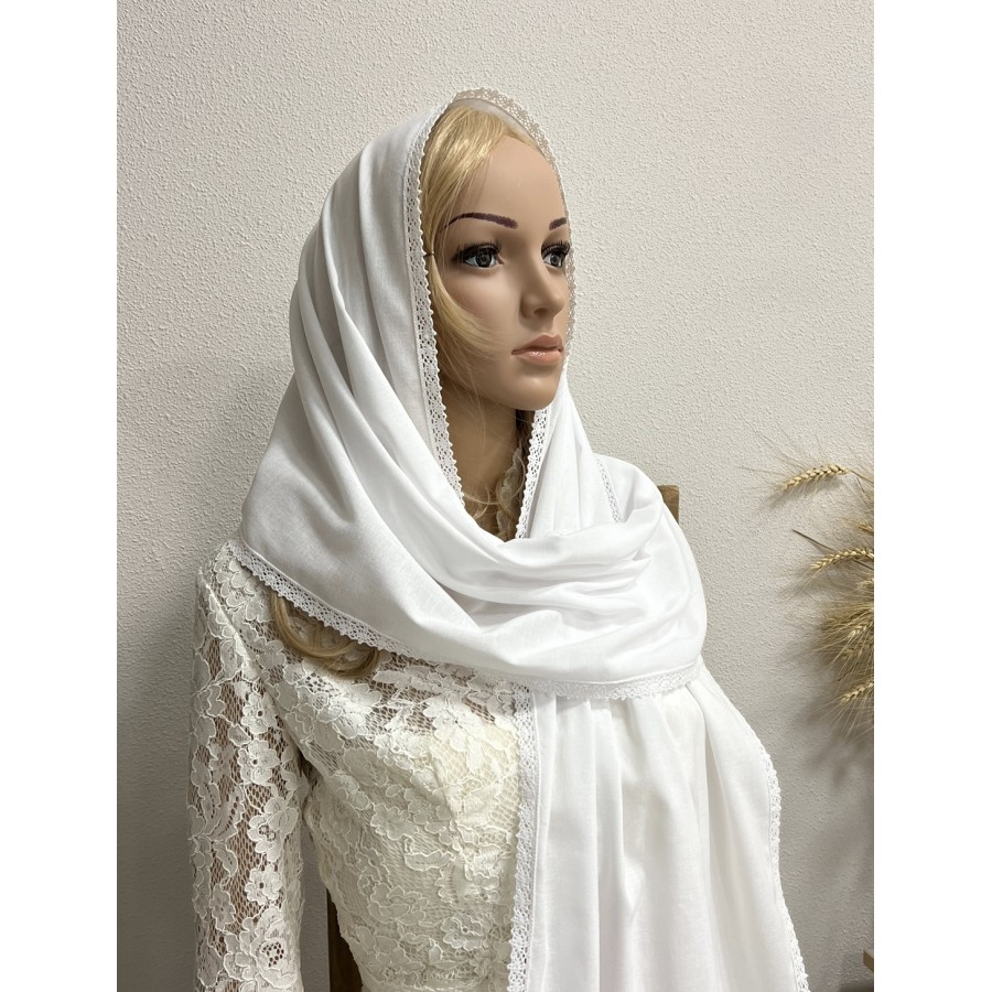 Натуральний палантин в білому кольорі з білим бавовняним мереживом. Розмір 45x205 см. Форма прямокутна. Легкий, зручний та не спадає з голови.