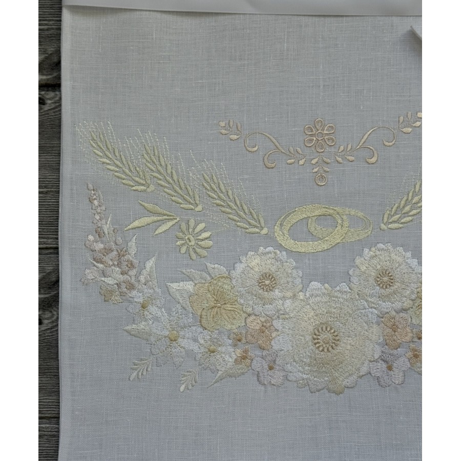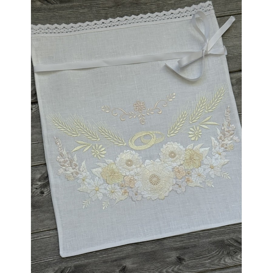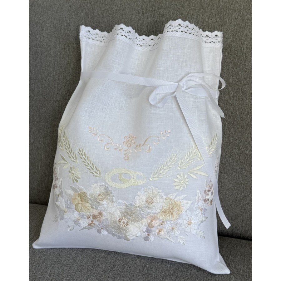 Мішечок для хліба на вінчання з білого натурального льону та з машинною вишивкою в ніжних тонах. Розмір 36х43 см.