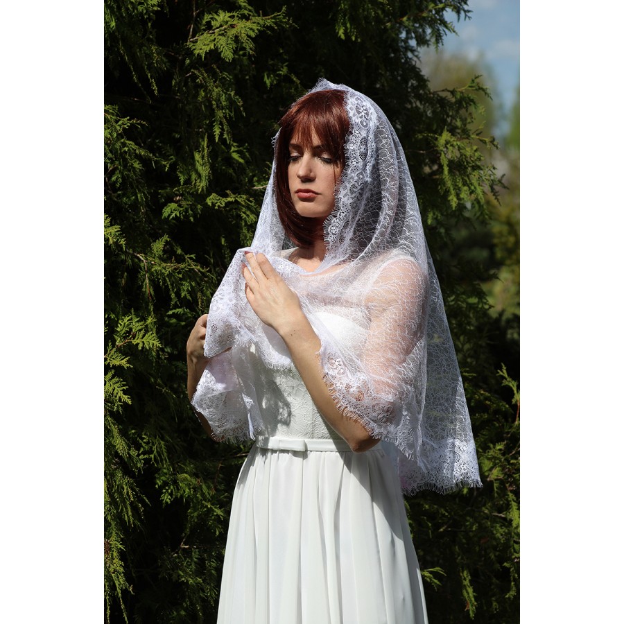 Платок полукруглый из нежного кружевного полотна в белом или айвори цвете с ажурным краем шантильи. Идеальный вариант в церковь на венчание, крестины и для церемонии снятия фаты на свадьбе. Мягкий материал, не скользит на голове. Размер 85Х160см. Производитель VA StyleTM Киев, Украина.