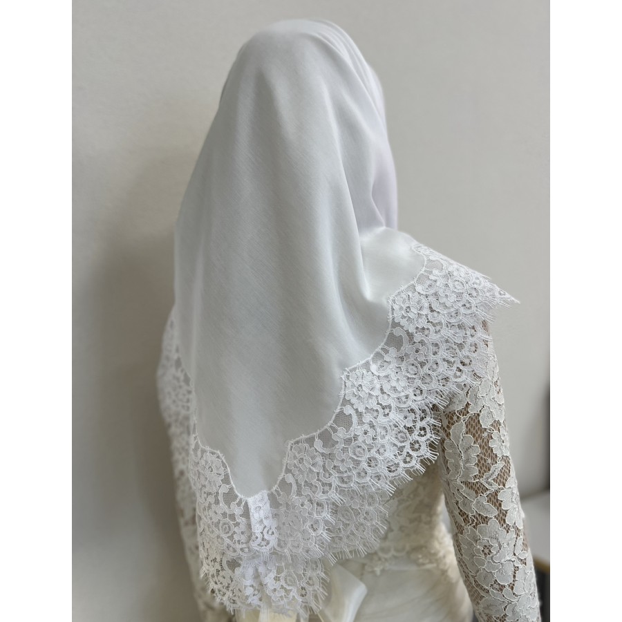 Платок из натурального шёлк- батиста в белом цвете с французским кордовым кружевом шантильи. Размер платка 104х104 см. Платок имеет квадратную форму. Подойдет как головной убор в церковь, на свадьбу, на венчание или крестины.
