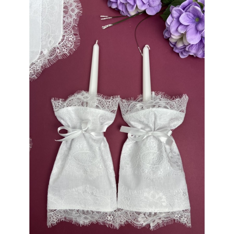 Набір платочків та свічки для вінчання, хрестин. В набір входять- два квадратні платочка з якісної відбіленої бавовни та з французським мереживом шантільї 35х35 см, два тримачі для свічок з білими парафіновими свічками (розмір тримачів 25 см висота, 10 см ширина), та серветки під обручки або для хрестика. Робота студіі VA Style Київ.