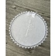 Кругла серветка з білою вишивкою на білій бавовні (яскравий біло-голубоватий віддтінок тканини та мережива) для обручок на вінчання чи для хрестика на хрестини. Діаметр 20 см