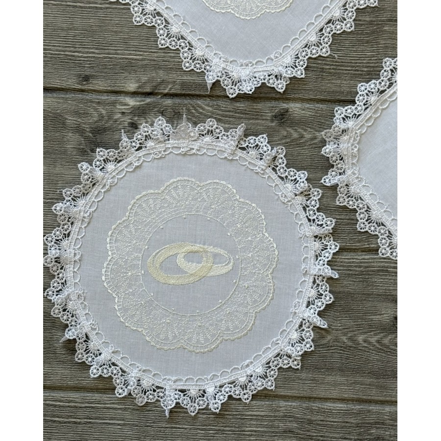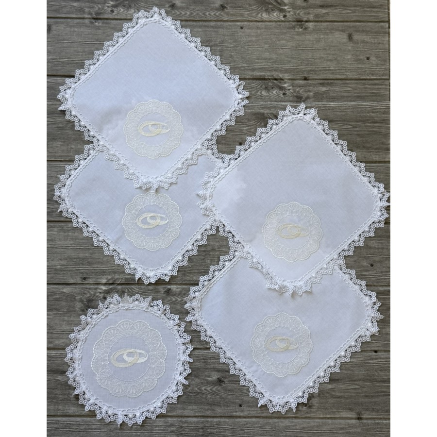 Набір хустинок з білої бавовни з машинною вишивкою молочним шовком. Комплект- 4 квадратні хустинки під свічки, вінці для вінчання 29х29 см. Кругла серветка для обручок, діаметр 23 см.