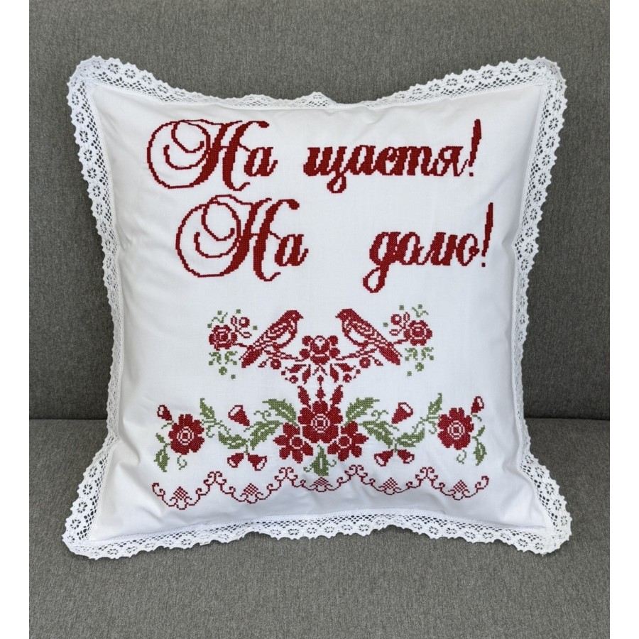 Весільна подушка для нареченої на зняття фати. Матеріал бязь- бавовна, машинна вишивка яскравим шовком, декорована мереживом по краях. Розмір 50х50 см