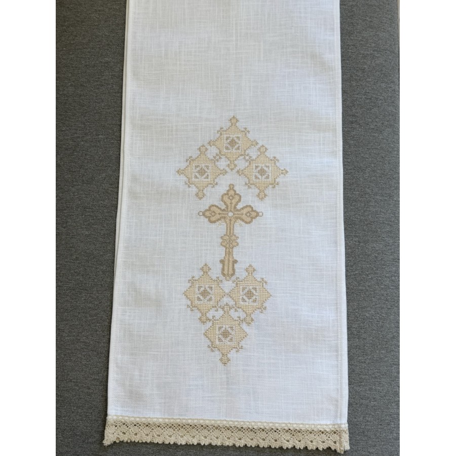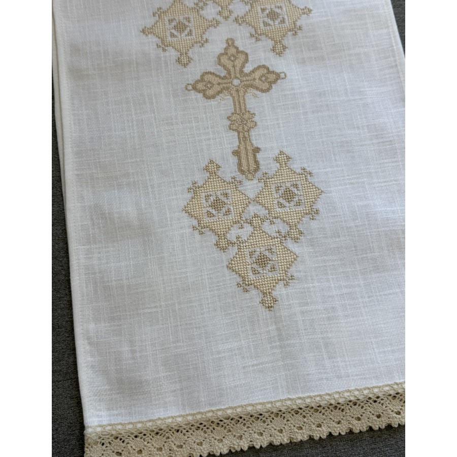 Рушничок з натурального фактурного льна білого кольору та з машинною вишивкою і мереживом бежевого кольору. Розмір 29х150см. Ідеально як рушник на ікону, для рук, закладка-рушник до Євангеліє, стрічка-рушник до Великодня. Виробник VA Style Київ.