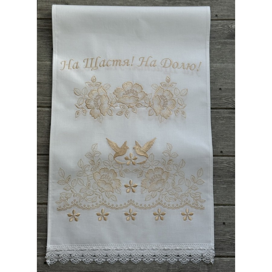 Рушник довгий з бавовни білого кольору та з машинною вишивкою золотисто-бежевим шовком. Розмір 40х190 см см. Ідеально на весілля під коровай, на вінчання під ноги, сватання. Виробник VA Style Київ.