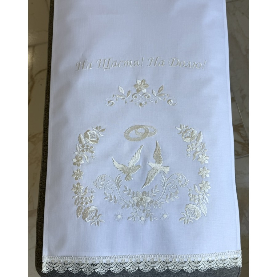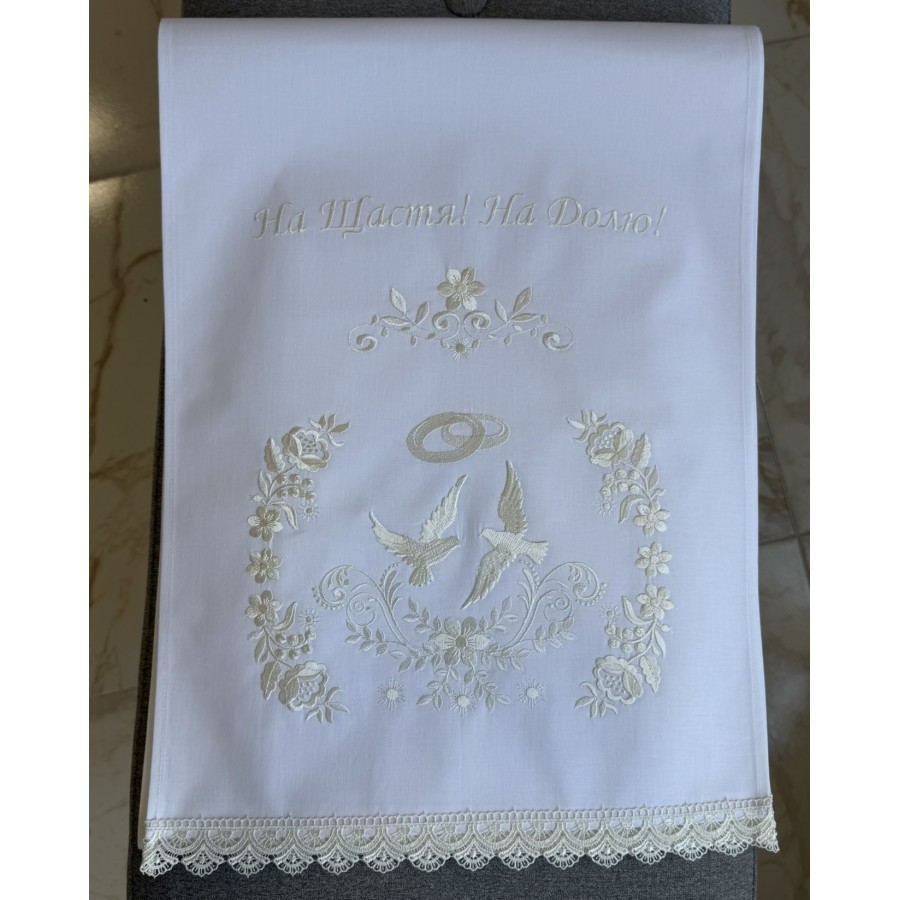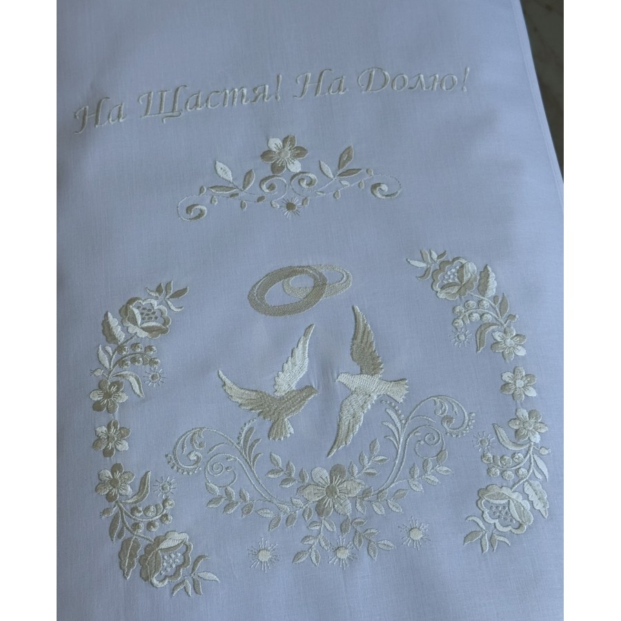 Рушник з бавовни (бязь) білого кольору та з машинною вишивкою молочним шовком. Розмір 40х200 см. Ідеально на весілля,під коровай, вінчання, сватання. Виробник VA Style Київ.