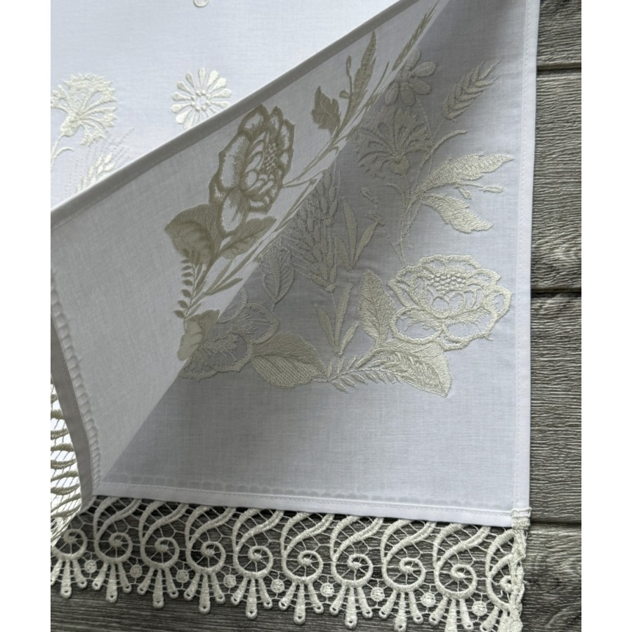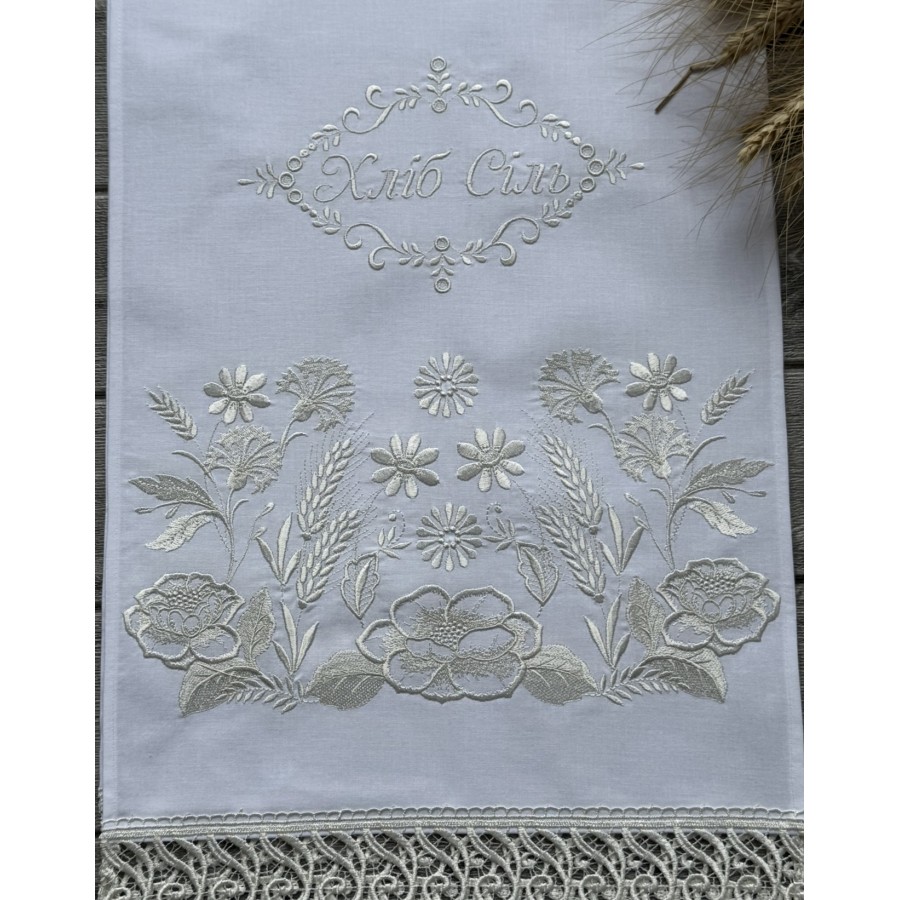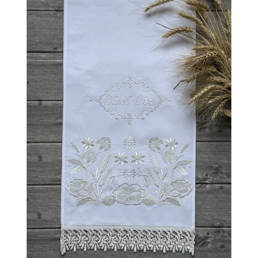 Рушник з бавовни (бязь) білого кольору та з машинною вишивкою молочним (айворі) шовком та з молочним мереживом. Розмір 37х163 см. Ідеально на весілля,під коровай, вінчання, сватання. Виробник VA Style Київ.
