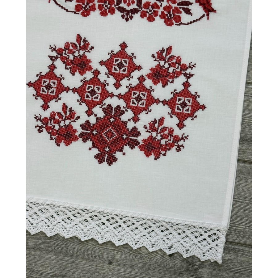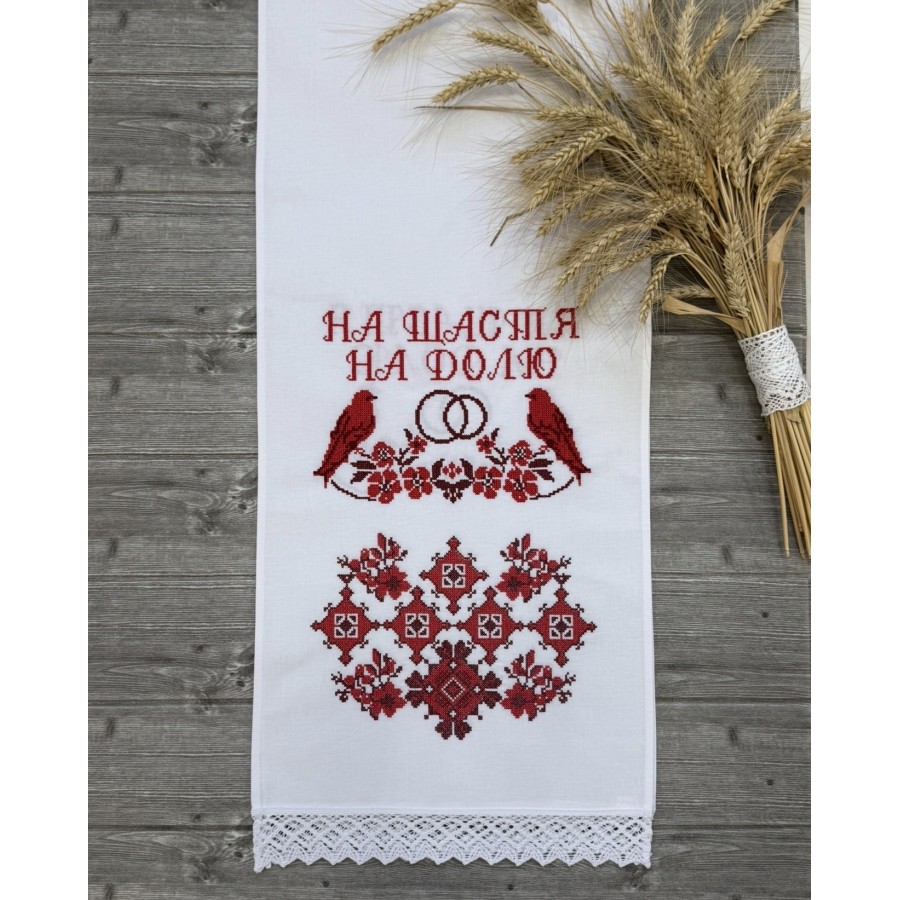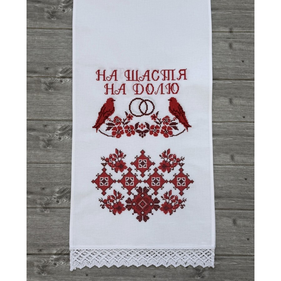 Рушник з бавовни (бязь) білого кольору та з машинною вишивкою червоним шовком. Розмір 39х210 см. Ідеально на весілля,під коровай, вінчання, сватання. Виробник VA Style Київ.