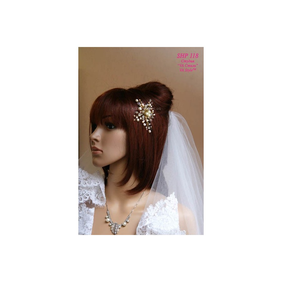 Украшение на шпильке в золотом цвете с натуральным речным жемчугом молочного и персикового цвета, стразами и горными кристаллами. Ручная работа. Размер плетения примерно 9Х6 см.