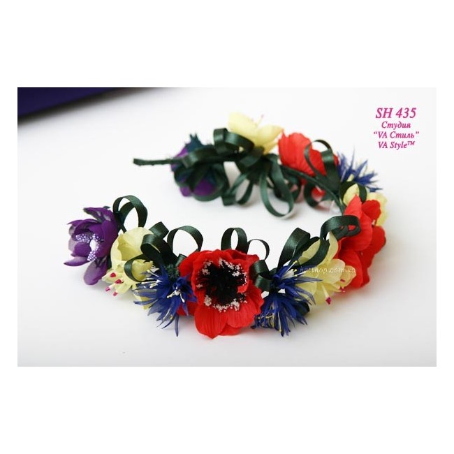 Ободок-веночек с маками и фантазийными цветами ручной работы.Основа- металлический ободок обтянутый зеленым атласом. Можно одевать как обруч и как веночек. Можем изготовить на заказ в любых цветах!