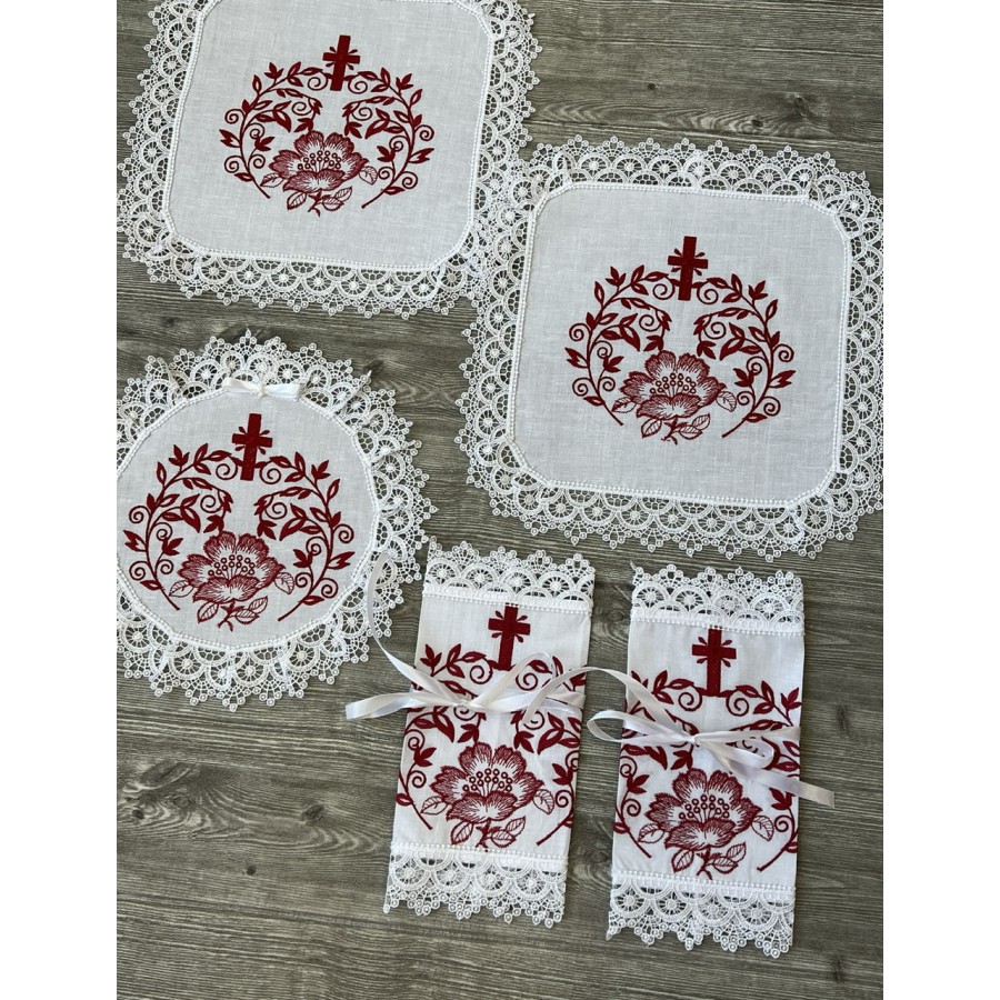 Набір платочків на вінчання з білої тонкої бавовни та мережива з машинною вишивкою бордовим шовком. В комплекті- два платочки тримати вінці (25х25см) та два тримачі на свічки ї кругла серветка під обручки.