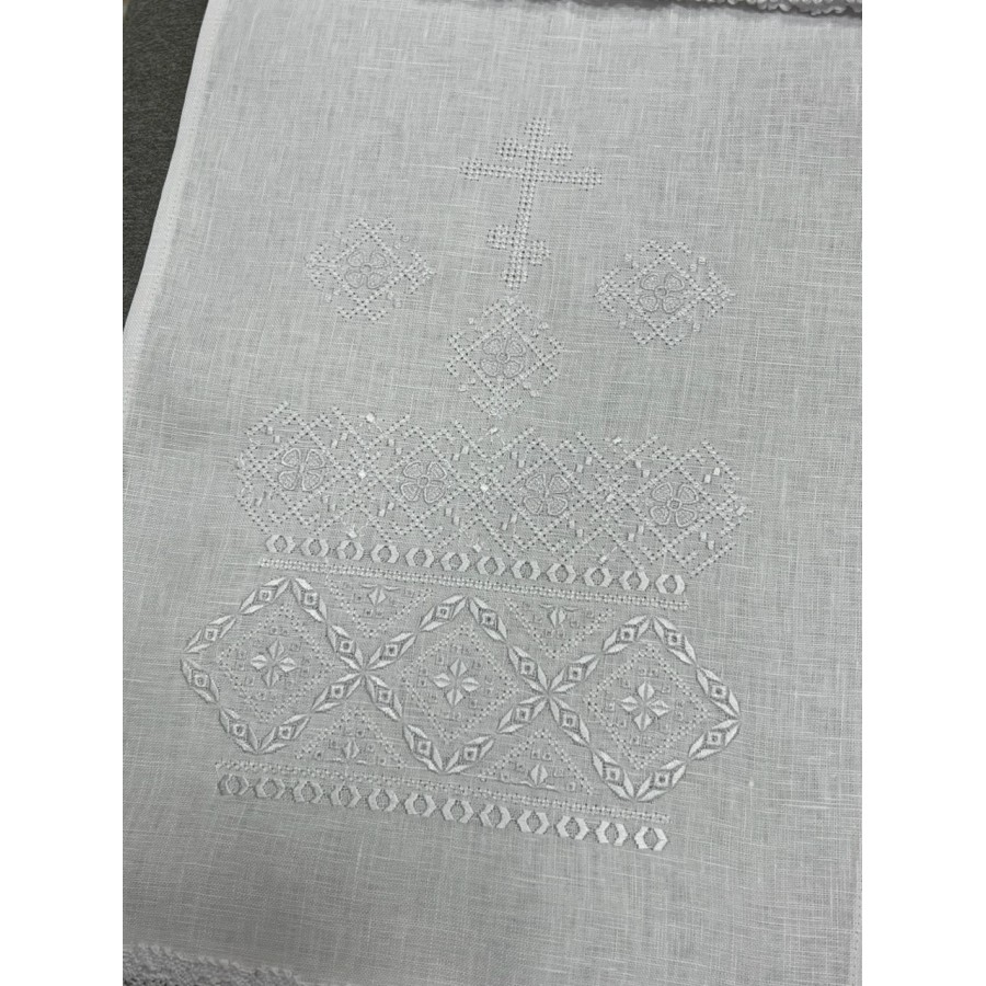 Пара рушників під ікони з на білому преміальному льні з машинною вишивкою білим шовком. Декоровані натуральним мереживом. Розмір 30х150см. Ціна за пару. Виробник VA Style Київ, Україна