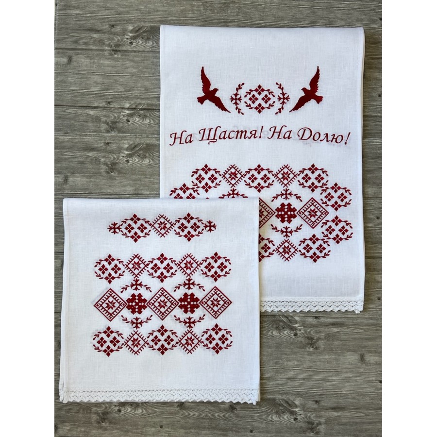 Базовий набір на вінчання з машинною вишивкою шовком на білому преміальному льні в червоному кольорі. В комплекті- рушник під ноги 40Х180-200 см, рушник для рук 30х150 см, два платочки тримати вінці, два платочки для свічок та кругла серветка під обручки. Також окремо можна докупити пару рушників під ікони та інше. Дизайн, вишивка студія VA Style Київ, Україна.