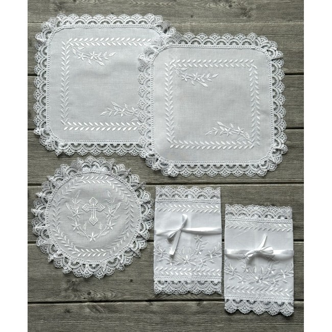Набір платочків БЕЗ рушників на вінчання з машинною білою вишивкою на білій бавовні. В комплекті- два платочки тримати вінці, два тримачі для свічок та кругла серветка під обручки. Також окремо можна докупити пару рушників під ікони та інше. Дизайн, вишивка та виготовлення -студія VA Style Київ.