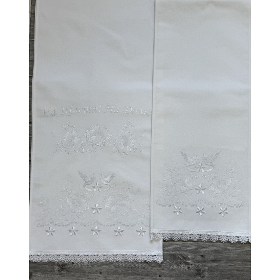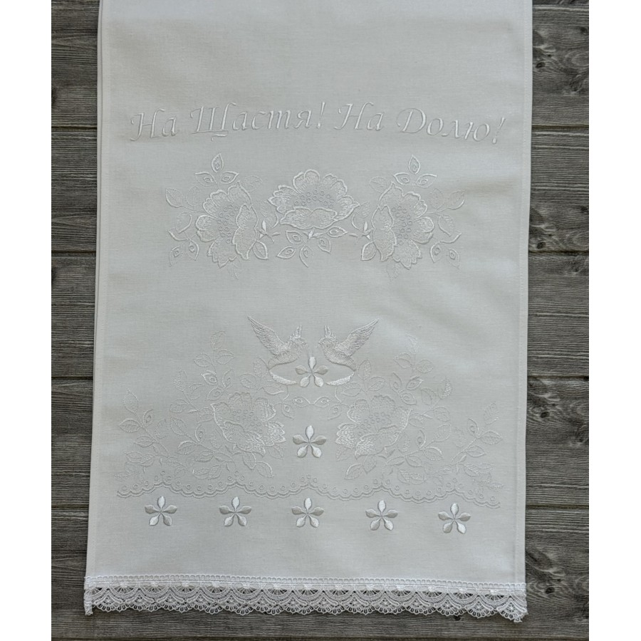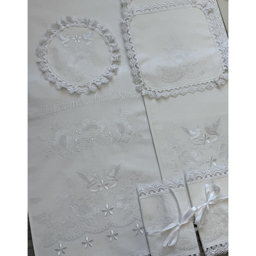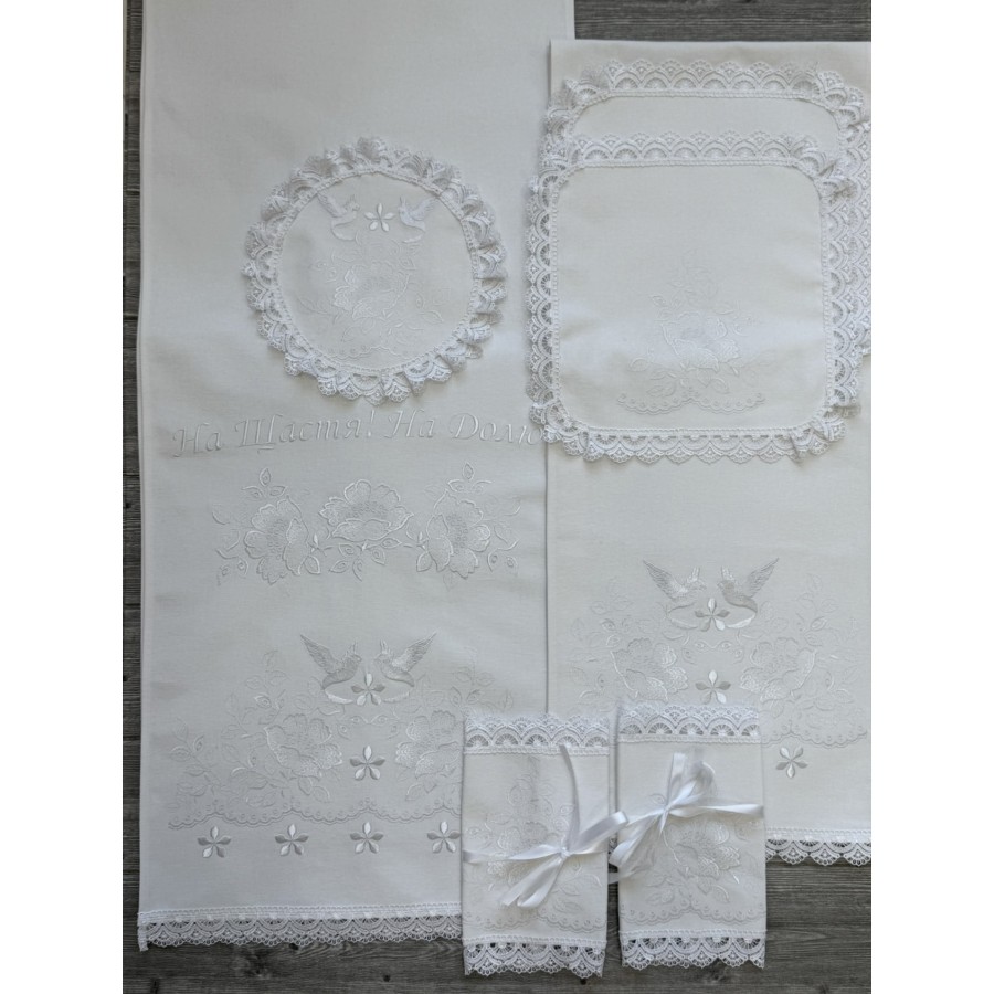 Базовий набір на вінчання з машинною білою вишивкою на білому домотканому полотні (100% бавовна). В комплекті- рушник під ноги 40х200см, рушник для рук 30х150 см, два платочки тримати вінці, два платочки для свічок та кругла серветка під обручки.