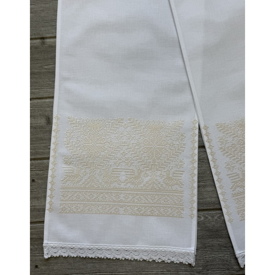 Пара рушників на ікони з машинною вишивкою на білій бавовні кремовим шовком.Декоровані мереживом. Розмір 30х150 см. Ціна за пару. Виробник VA Style Київ, Україна.