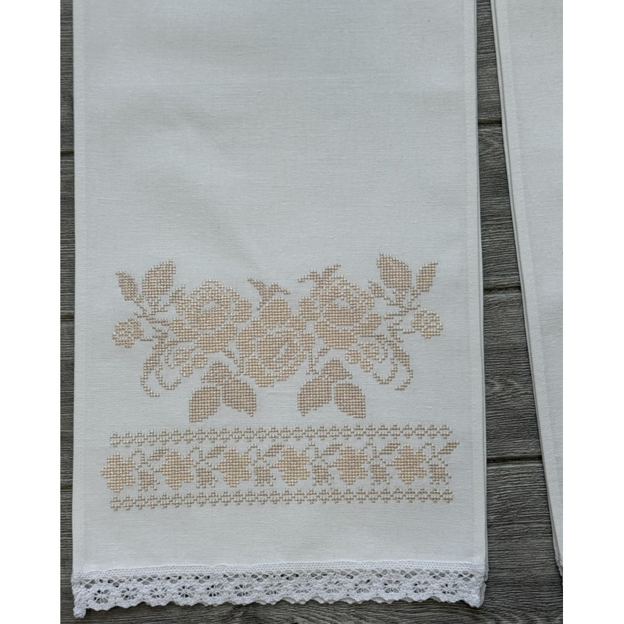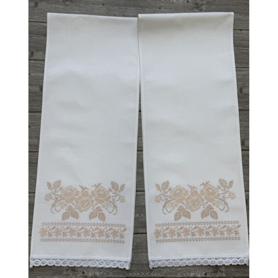 Рушники на ікони з машинною вишивкою у пудрових тонах на натуральному домотканому полотні. Декоровані натуральним мереживом. Розсір 30х150 см. Ціна за пару.