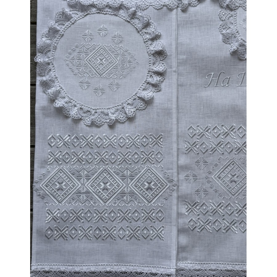 Базовий набір на вінчання з машинною білою вишивкою на льні колір білий. В комплекті- рушник під ноги 40х200см, рушник для рук 30х150 см, два платочки тримати вінці, два платочки для свічок та кругла серветка під обручки. Також окремо можна докупити пару рушників під ікони та інше. Дизайн, вишивка та виготовлення -студія VA Style Київ.