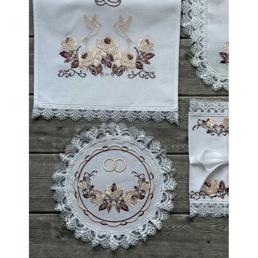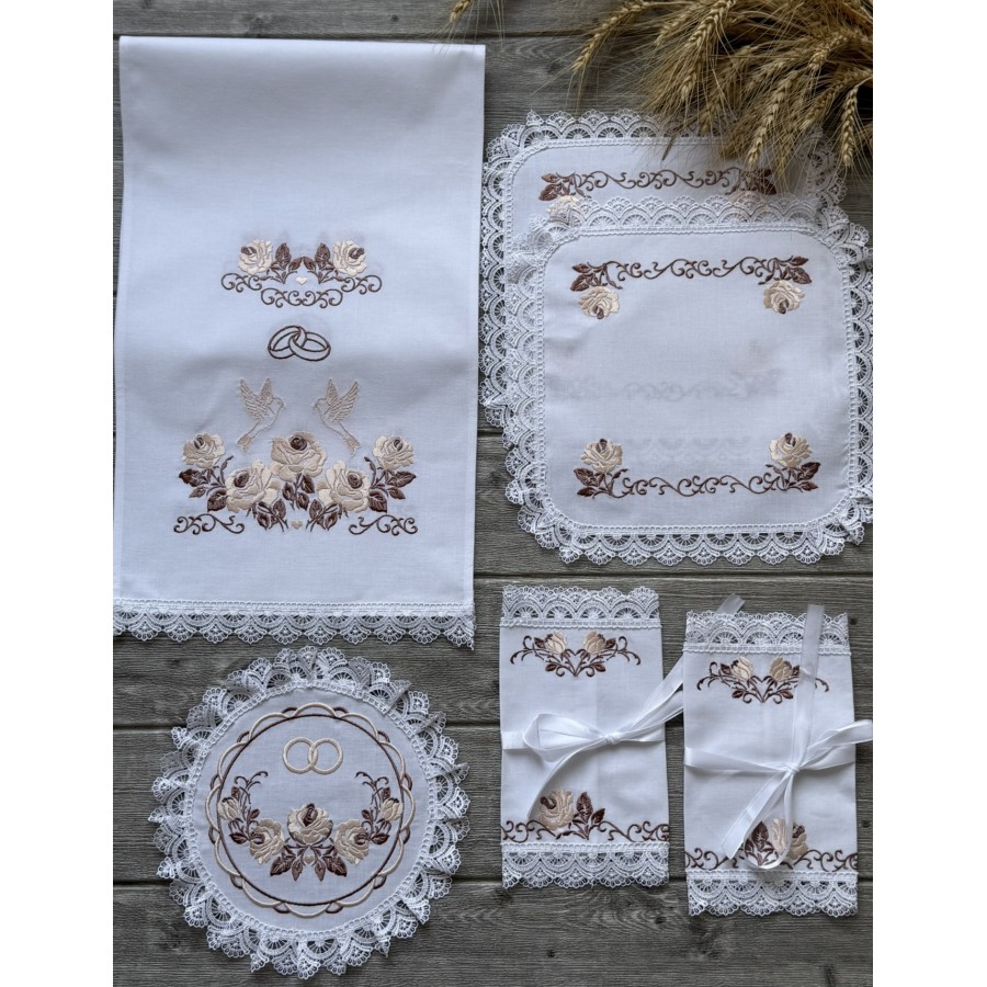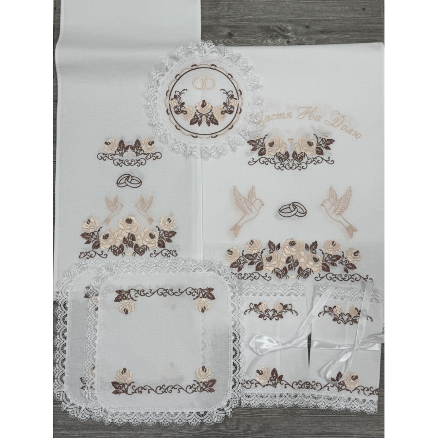 Базовий набір на вінчання з машинною вишивкою коричнево-пудровим шовком на відбіленій бавовні. В комплекті- рушник під ноги 40Х180-200 см, рушник для рук 30х150 см, два платочки тримати вінці, два тримачі для свічок та кругла серветка під обручки. Також окремо можна докупити пару рушників під ікони та інше. Дизайн, вишивка студія VA Style Київ, Україна.