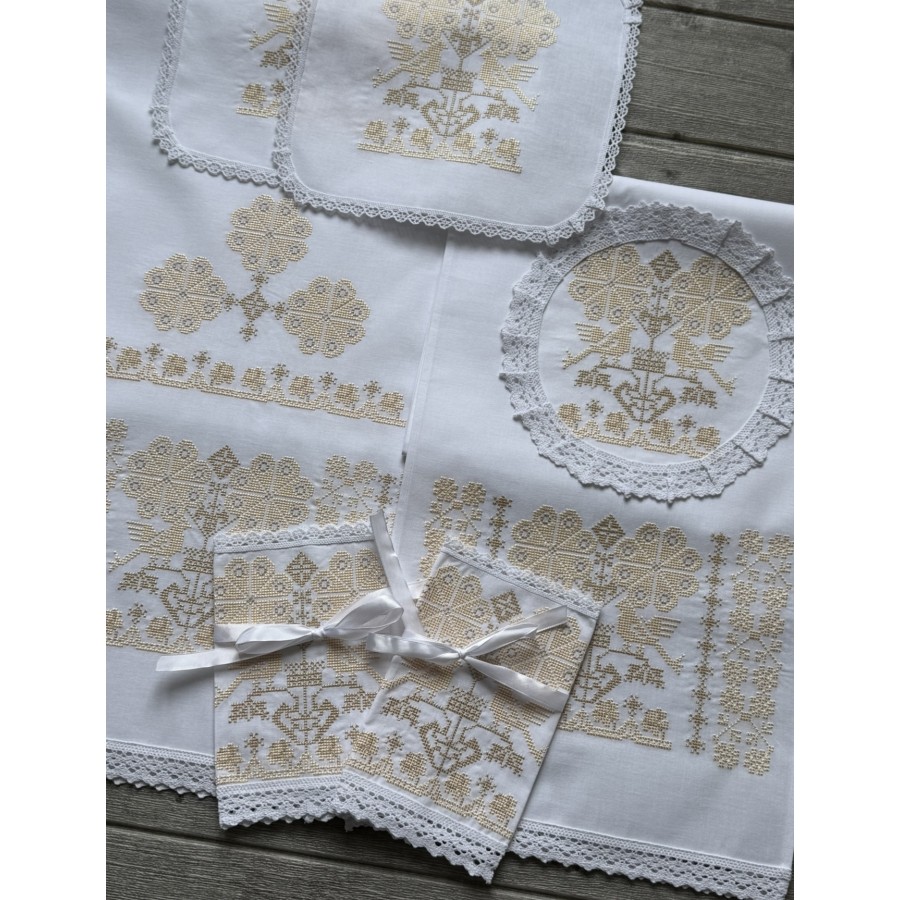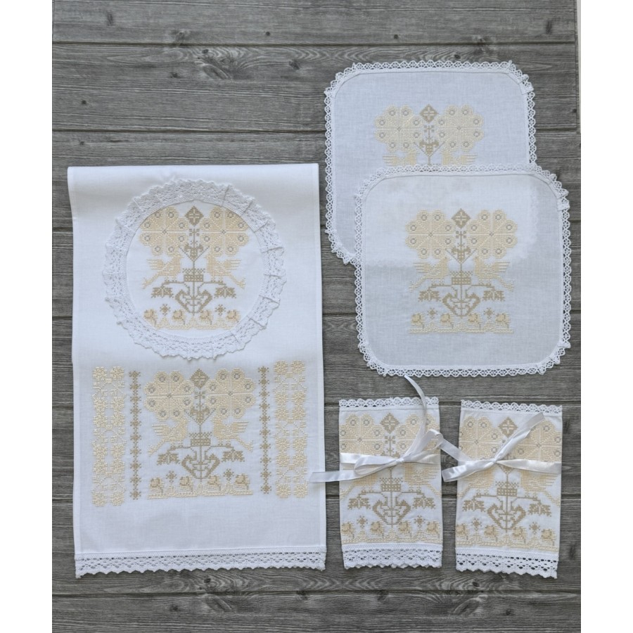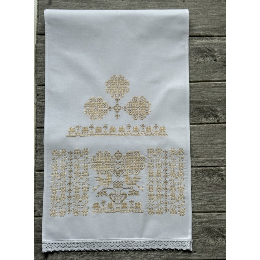 Базовий набір на вінчання з машинною пісочно-бежевою вишивкою на білій бавовні. В комплекті- рушник під ноги 40Х200 см, рушник для рук 30х150 см, два платочки тримати вінці, два тримачі для свічок та кругла серветка під обручки. Також окремо можна докупити пару рушників під ікони та інше. Дизайн, вишивка та виготовлення -студія VA Style Київ.