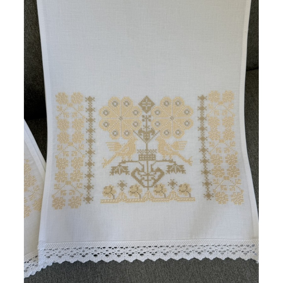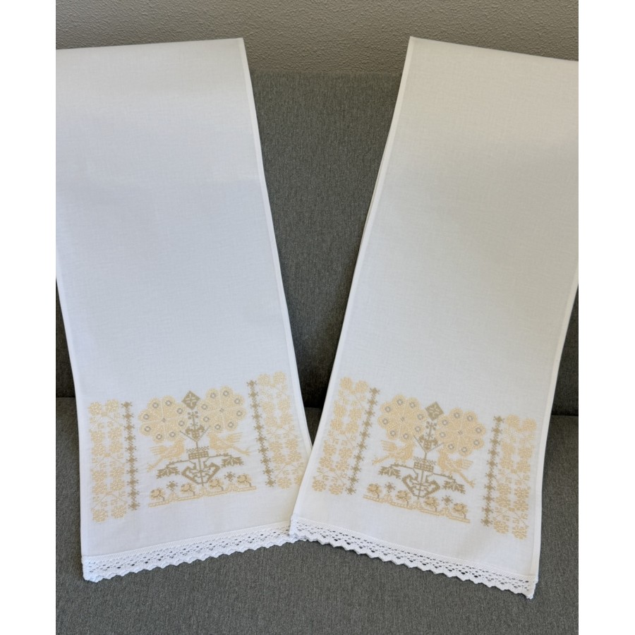 Пара рушників на ікони з машинною вишивкою на білій бавовні пісочно-бежевим шовком.Декоровані мереживом. Розмір 30х150 см. Ціна за пару. Виробник VA Style Київ, Україна.