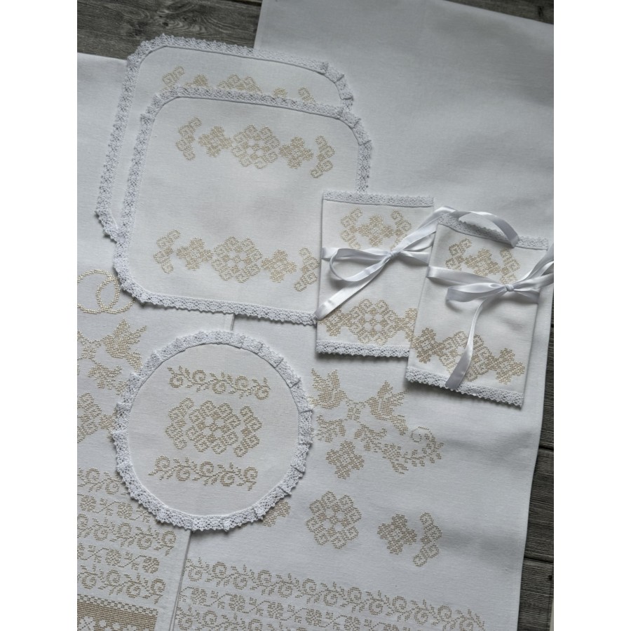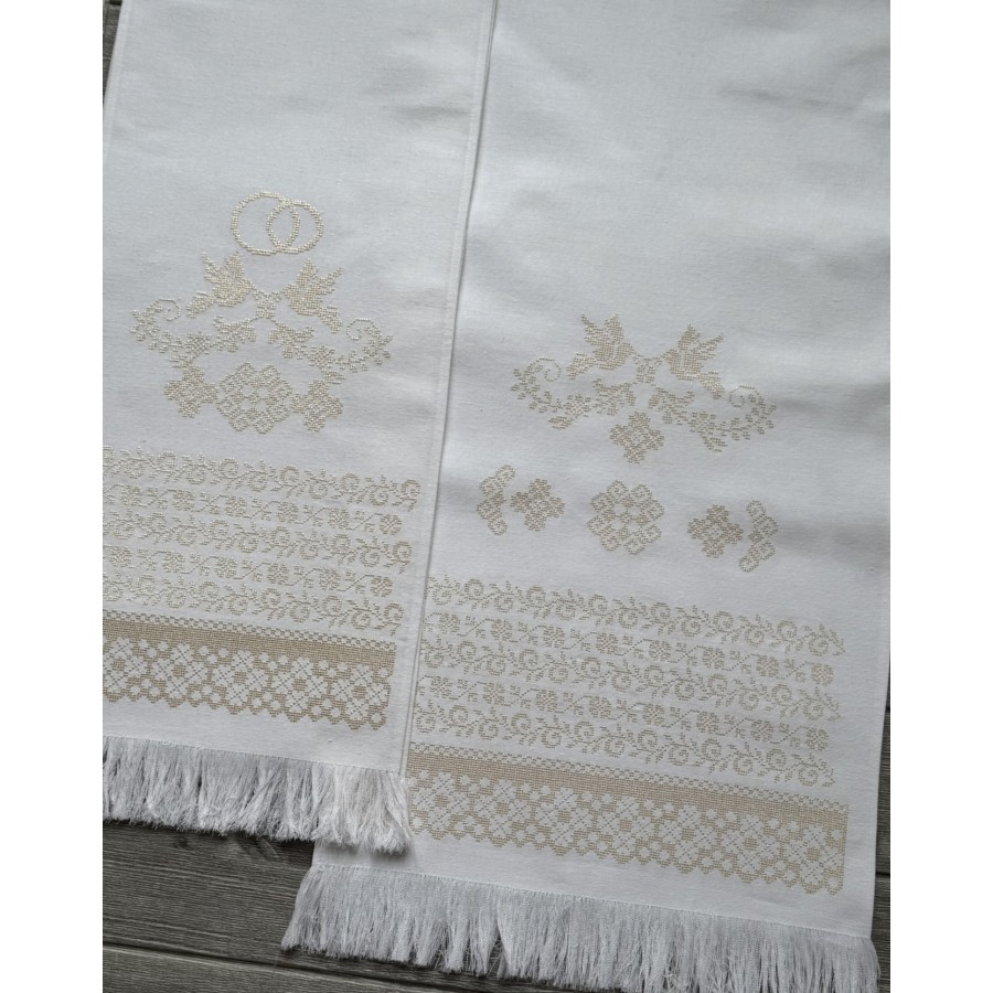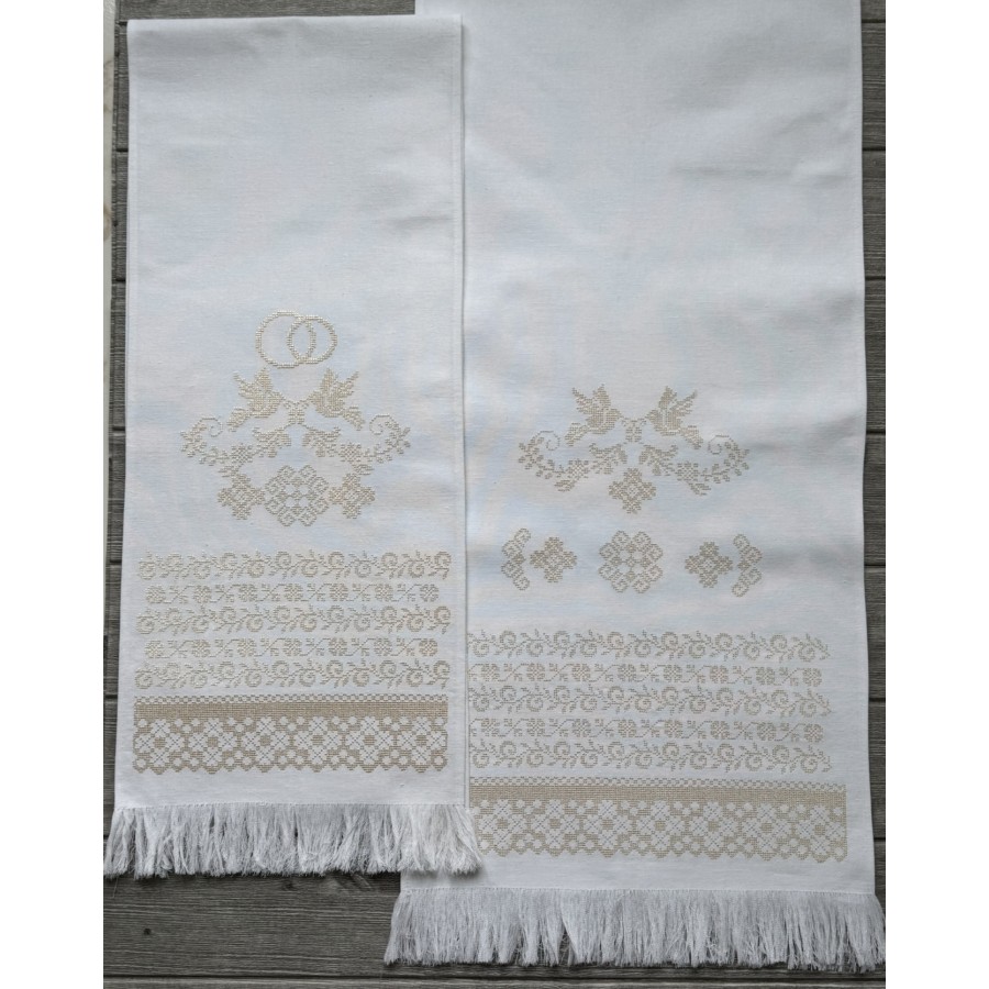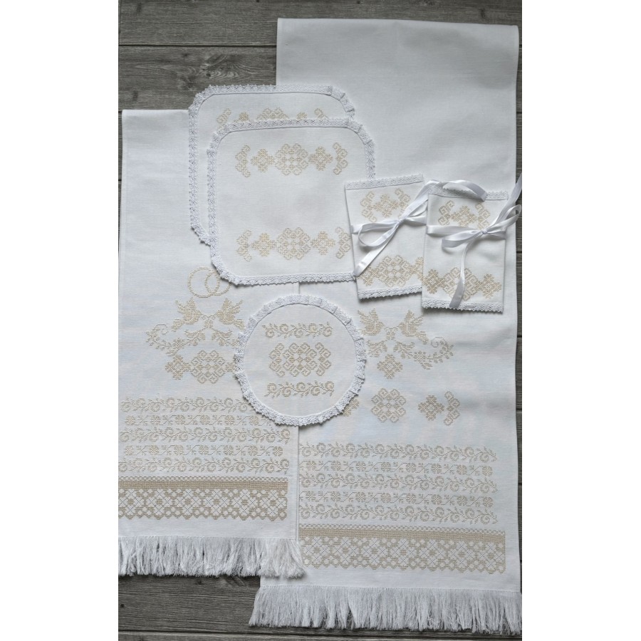 Базовий набір на вінчання з машинною вишивкою кремовим шовком на білому домотканому полотні. В комплекті- рушник під ноги 40Х180-200 см, рушник для рук 30х150 см, два платочки тримати вінці, два тримачі для свічок та кругла серветка під обручки. Також окремо можна докупити пару рушників під ікони та інше. Дизайн, вишивка та виготовлення -студія VA Style Київ.