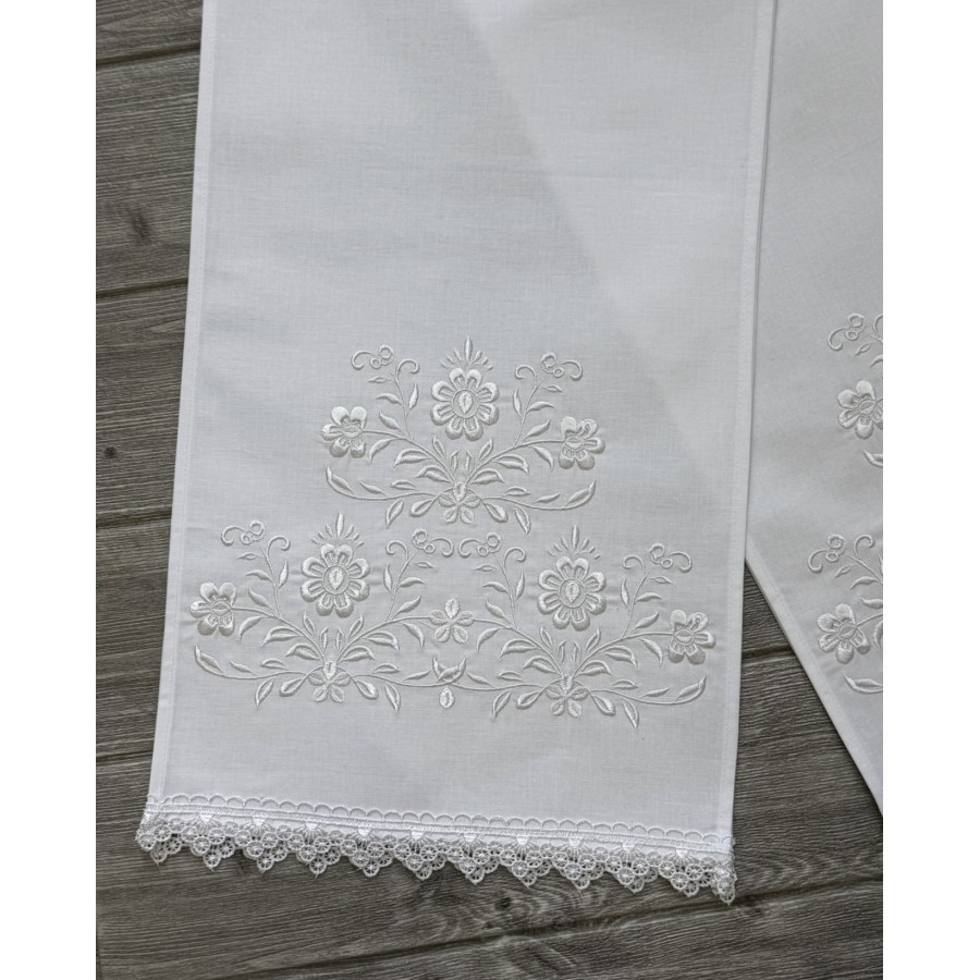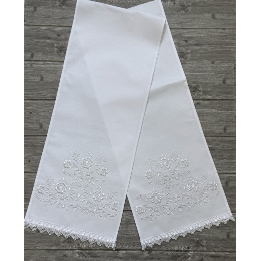 Пара рушників під ікони з машинною вишивкою на білій бавовні білим шовком.Декоровані мереживом. Розмір 30х150 см. Ціна за пару. Виробник VA Style Київ, Україна.