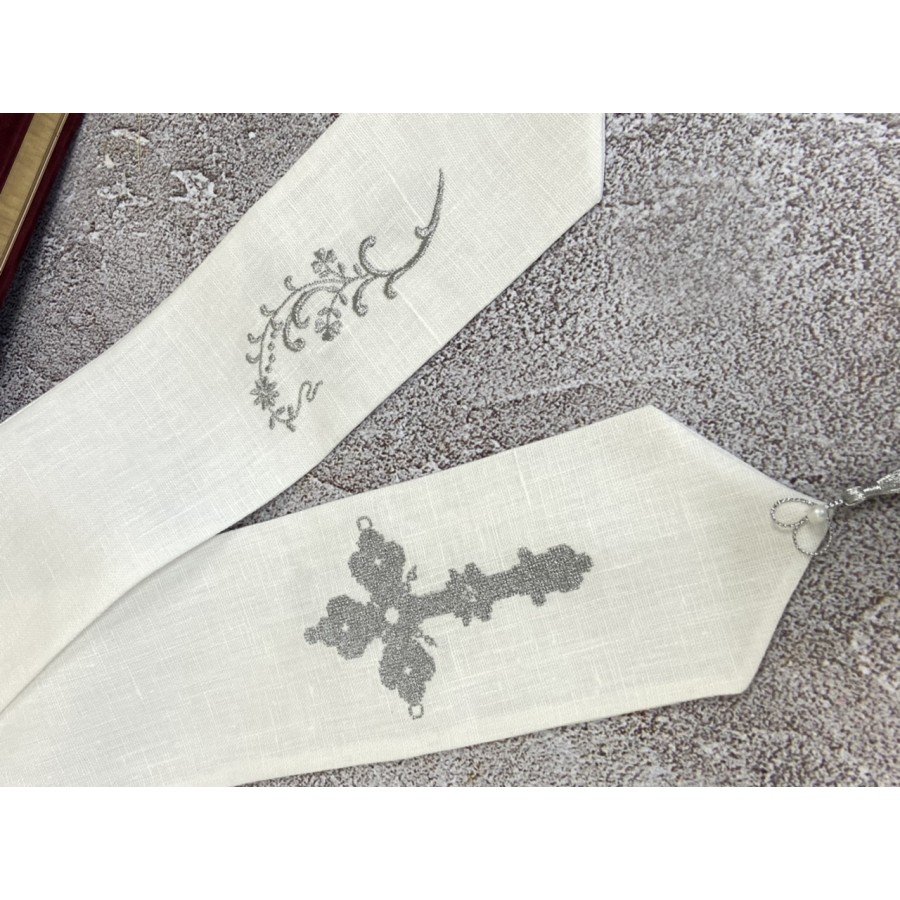 Заклкадка- лента в Евангелие из натурального льна белого цвета с машиной вышивкой серебром. Размер 10х150 см. Закладка двусторонняя с серебристыми кисточками.